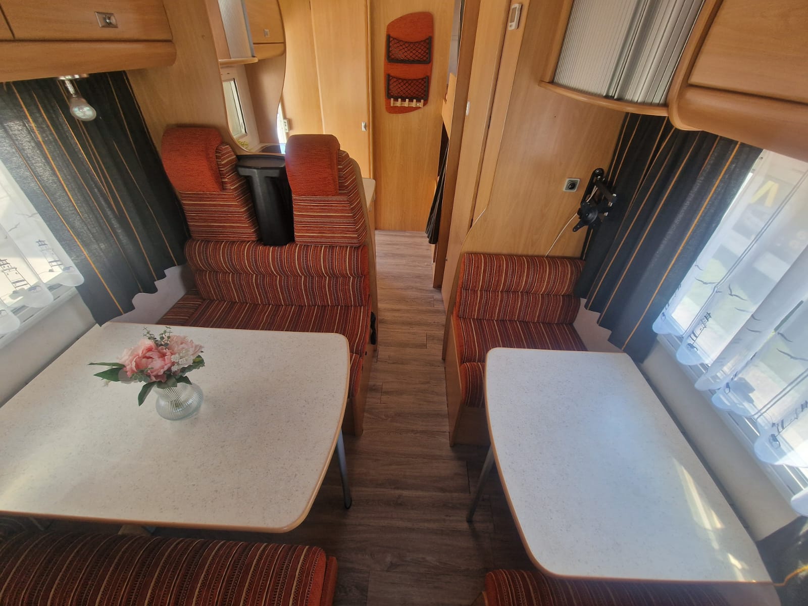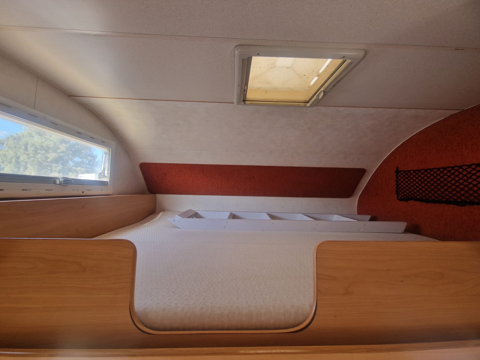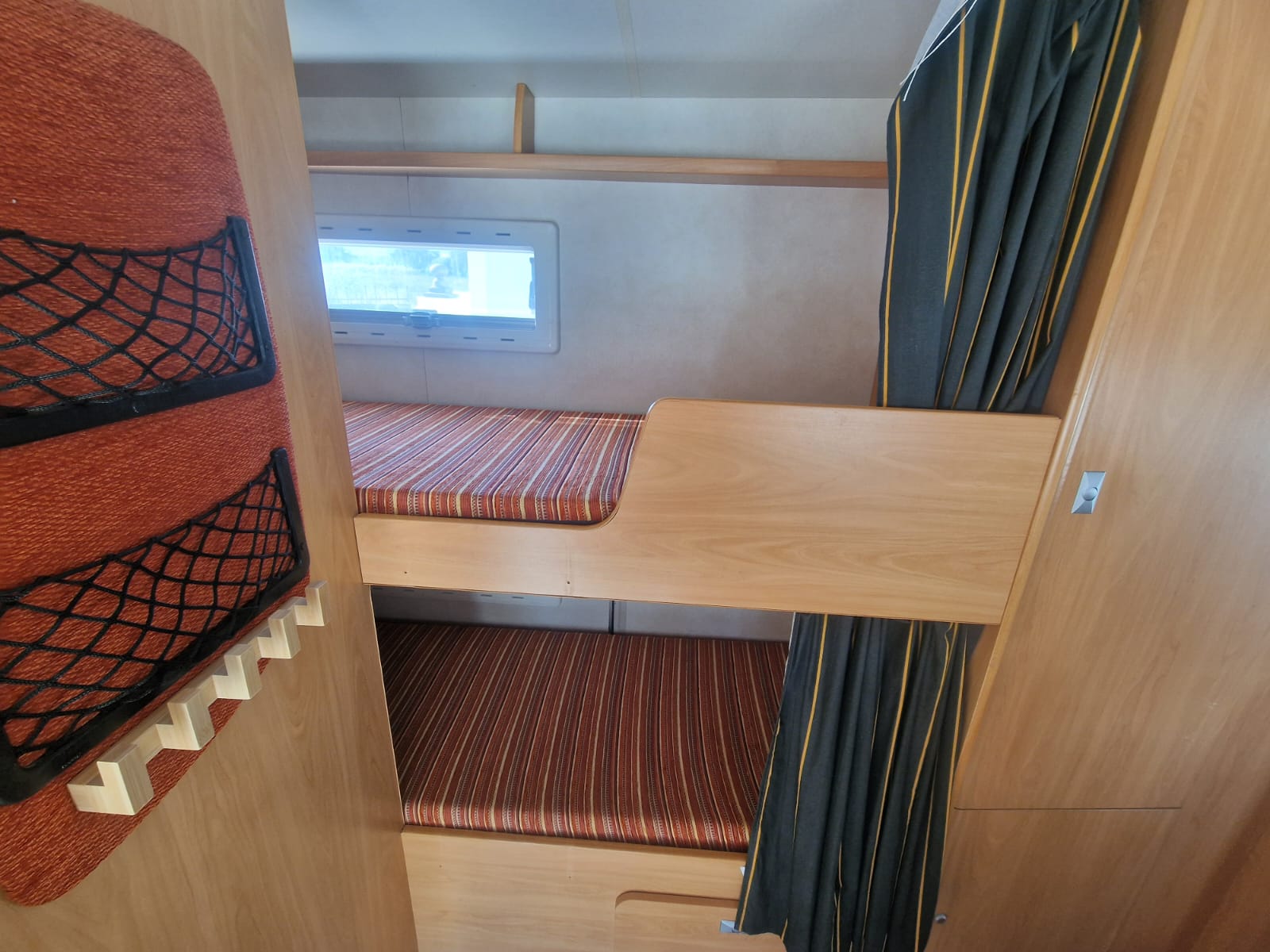 Dispone de doble salón convertible en cama, cama capuchina y 2 camas literas. Tiene baño completo con ducha y cocina muy amplia con nevera. Muchos armarios para almacenar. Todas sus ventanas van con mosquiteras y oscurecedores. Cámara trasera, portabicis. También dispone de un garaje de gran capacidad con unas medidas de su puerta de 108 de ancho y 130 de alto.